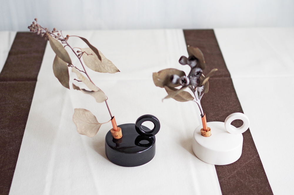 洗練されたデザインの花器は、シンプルなフォルムの陶磁器に、コルクと銅の挿し口が特徴的な作品。