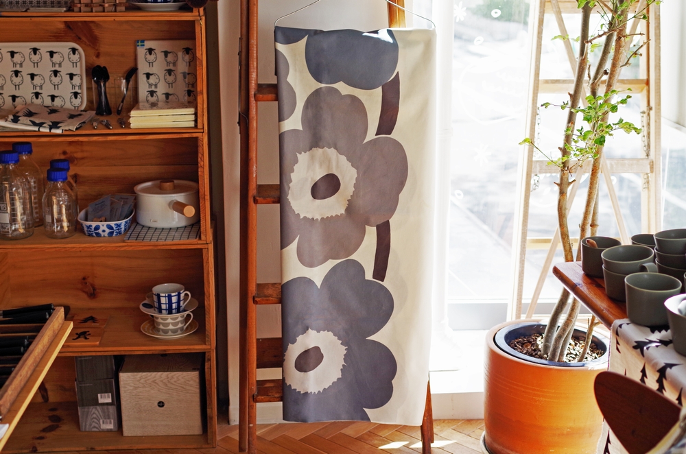 今回入荷したグレーのウニッコは、防水加工済みのファブリックなので、テーブルクロスや、テラス等のシェードとして加工するなど、野外での使い方の想定も含めて面白い。