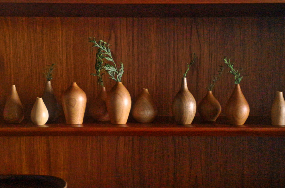 輪郭、曲線、年輪による模様や、木の色など、百首百様の一輪挿し。