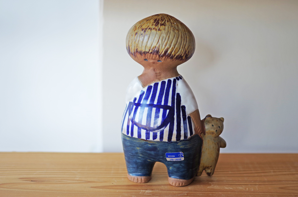いつもお友達のクマのぬいぐるみが居ないと、寝ることの出来ない、ちょっと甘えん坊のマーリンの、微笑ましい日常が想像できるオブジェです。
