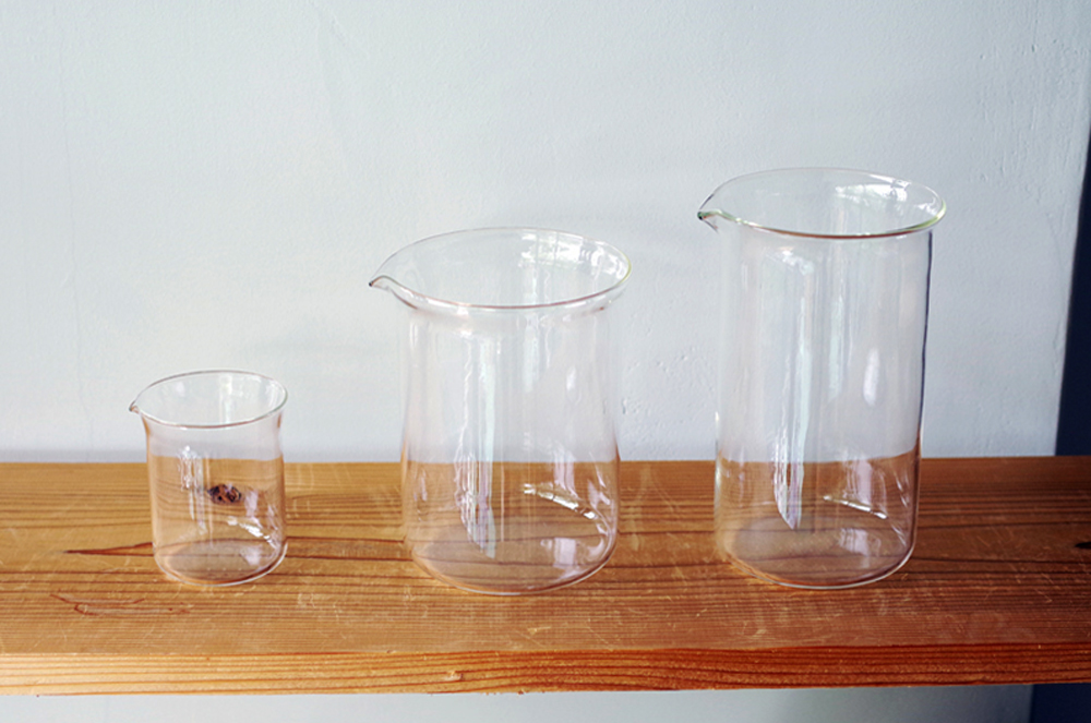 小泉ガラス製作所のビーカーは、ハンドメイドのためのちょっとした個体差があるのが面白い。