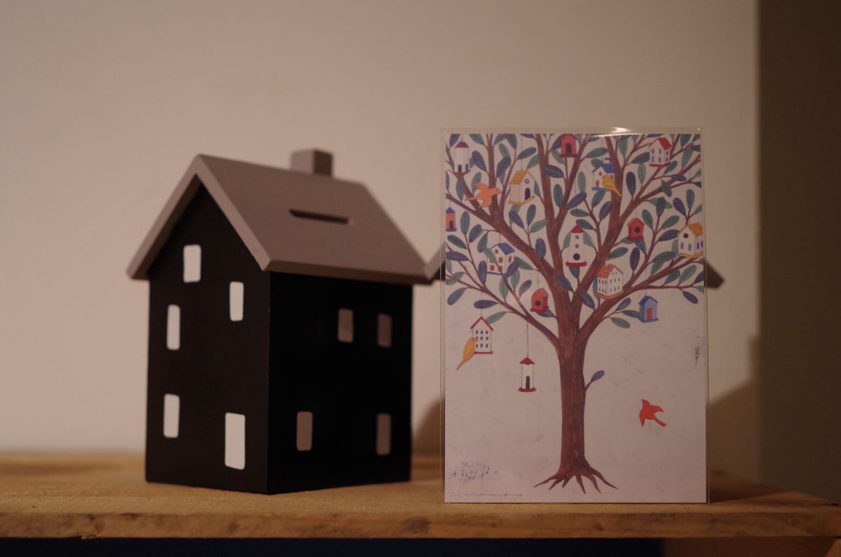 木から家がぶら下がっている、かわいらしいデザインのポストカード。