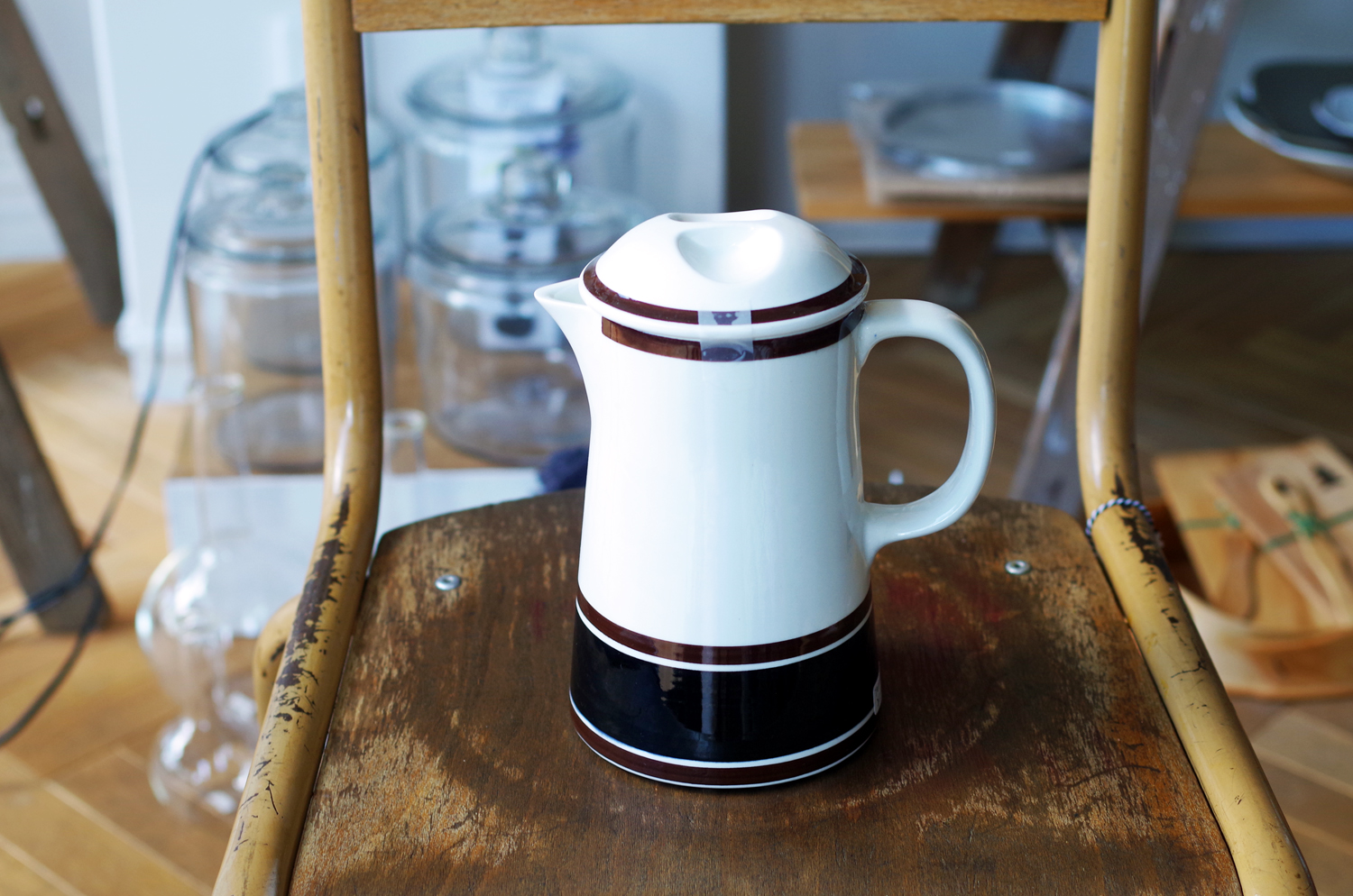 スラッと縦に伸びた陶器のポット。このスタイルのものはとても珍しい。