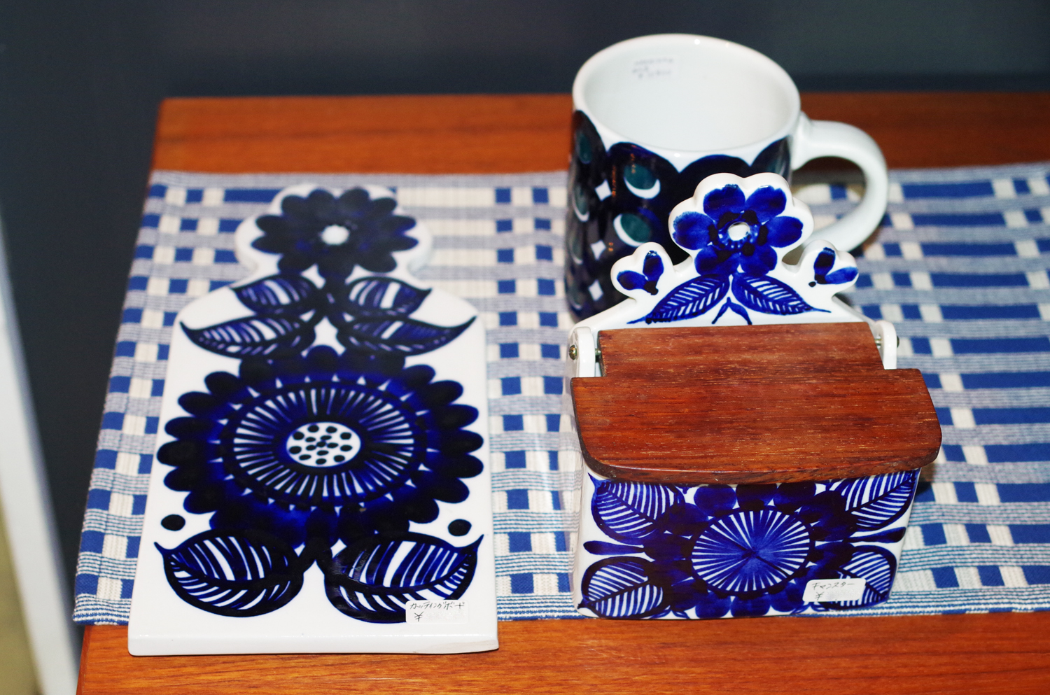 カッティングボードやソルトボックスなど、キッチン周りの用品が作られたシリーズで、作品ごとに筆で手書きされた、大胆で美しいタッチで描かれた青い花が印象的。
