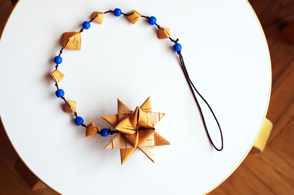 紐の途中途中の小さなひし形や、ビーズも含め、素敵な装飾品に仕上がってます。