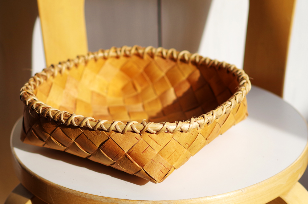 装飾に白樺の根を使った、篝(かがり)編みが個性的なバスケット。