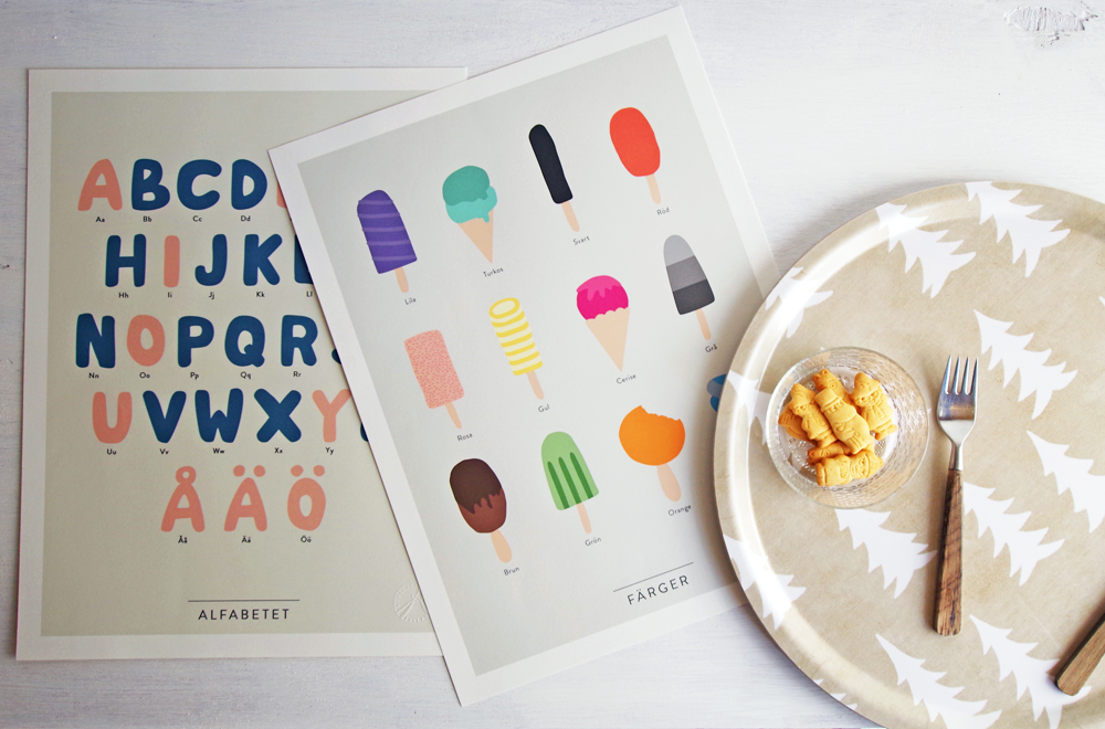 「Alphabet(アルファベット)」は、北欧地域特有のウムラウトが入った、スウェーデンのアルファベットと、発音表記が可愛らしいポスターです。