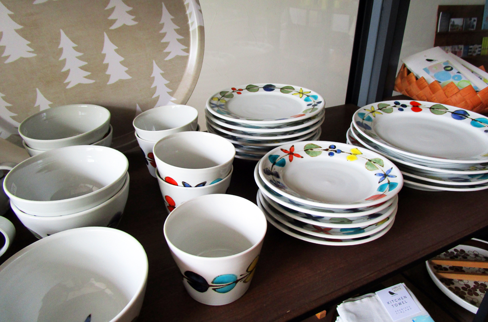 注目を浴びた、色鮮やかな花や葉や実などの図柄の面白さはもちろん、食器それぞれの造形の面白さも存分に魅力的な作品たち。