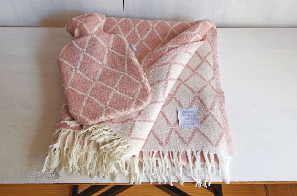 ピンクと白の昼夜織りで、表裏どちらでも素敵なデザインを楽しめるブランケット。