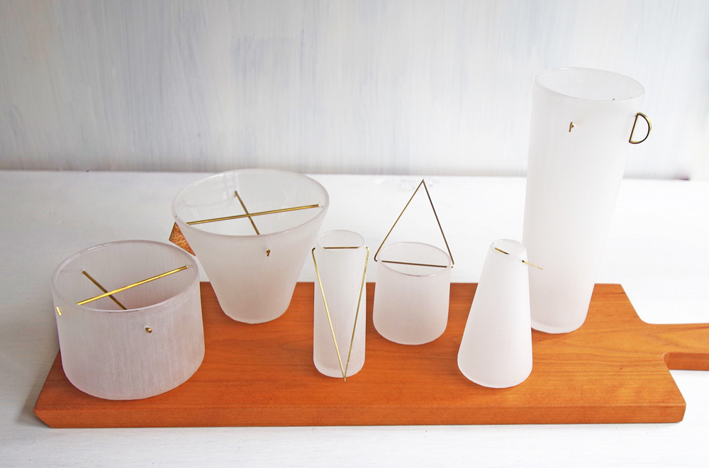 ガラスの表面に加工が施されている、真鍮付きの花器。