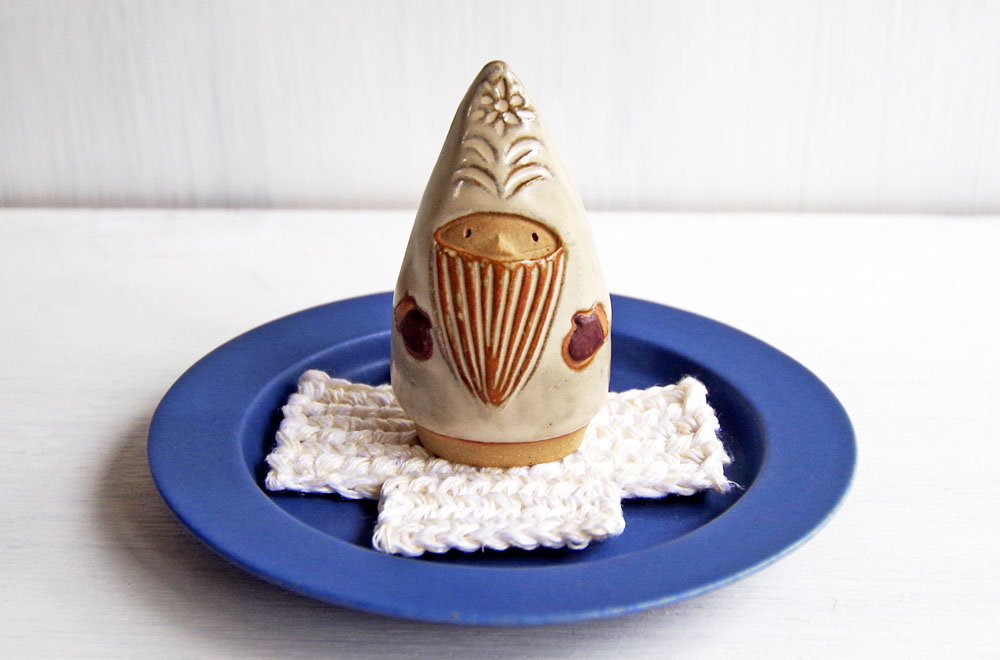 お髭のような模様と、手袋、頭巾にはお花の模様が可愛らしく、表情や佇まいにも心がほっこりと温かくなります。