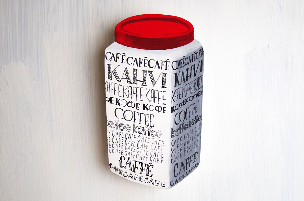 ARABIAの人気デザイナー「Esteri Tomula(エステリ・トムラ)」がデザインしたもので、フィンランド語・スウェーデン語・フランス語・英語の表記で「コーヒー」の文字が様々な字体で、全面に描かれています。