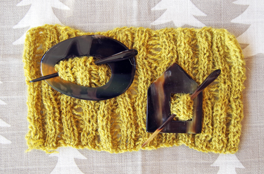 デンマーク「Hornvarefabrikken」より、現地の伝統工芸品、水牛の角を加工した、ショールピンが登場してます。