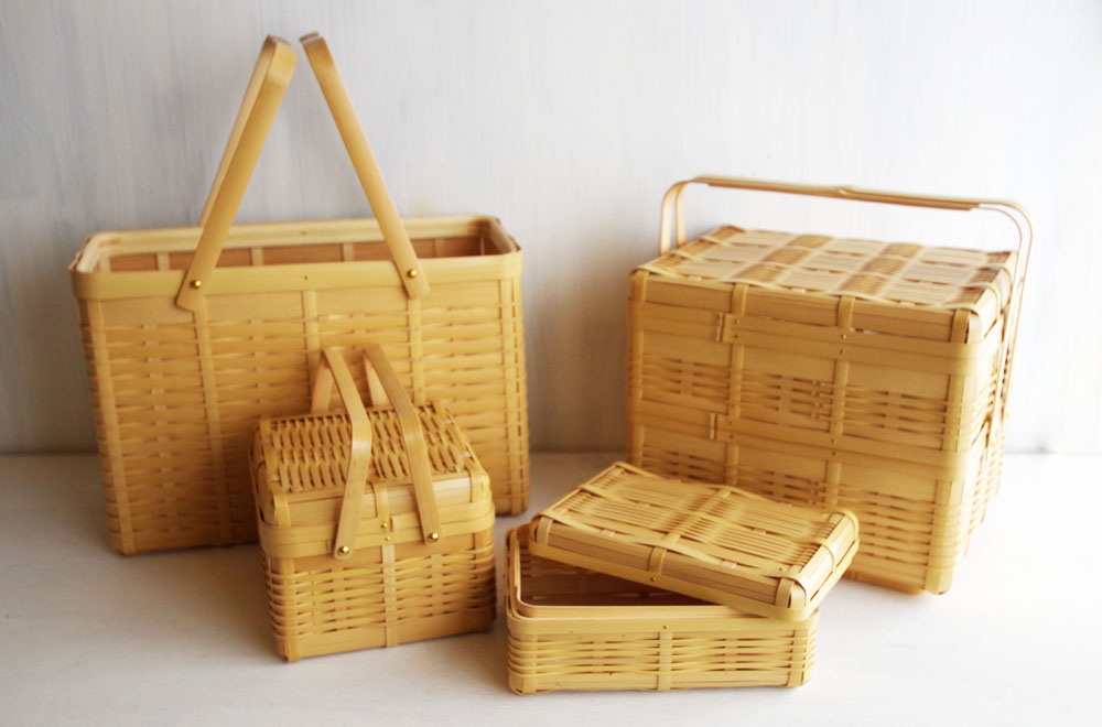 鹿児島県の白竹を使った「豆腐かご」、「手付弁当かご 大 二段」、「一段手付弁当かご」、「弁当かご」です。