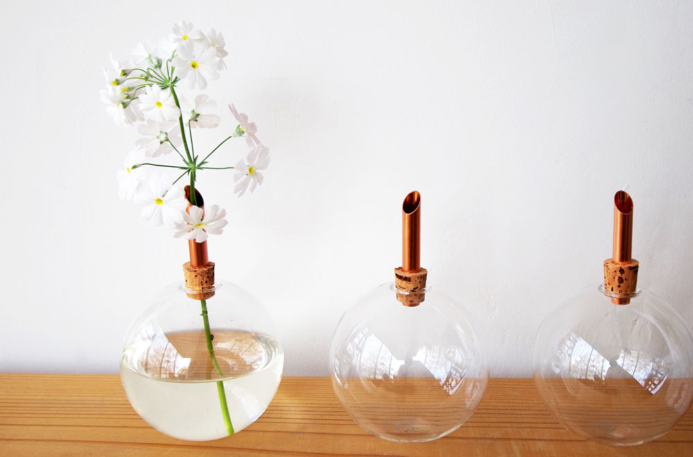 洗練されたデザインの花器は、シンプルなフォルムの手吹きガラスに、コルクと銅の挿し口が上品な印象。