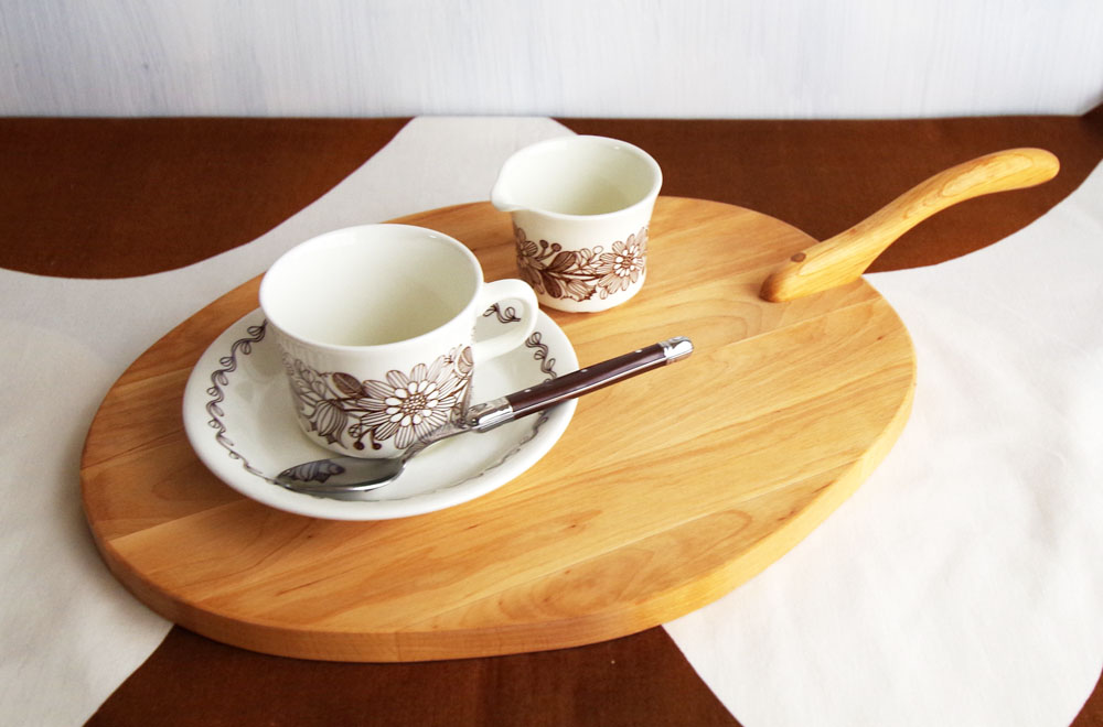 取っ手の形がとても個性的なカッティングボードは、テーブル上でのサービングボードとして、プレートのように使っても素敵。