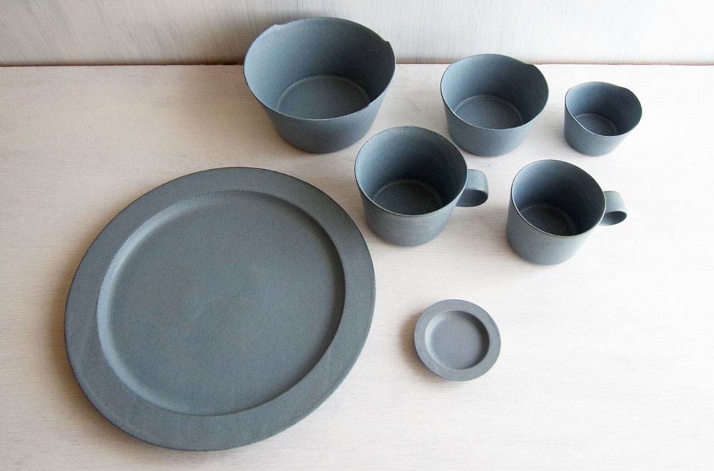 カップが2サイズ(matin、nuit)とプレートが2サイズ(matin、nuit)、ボウルが3サイズ(S、M、L)、店頭に並んでいます。