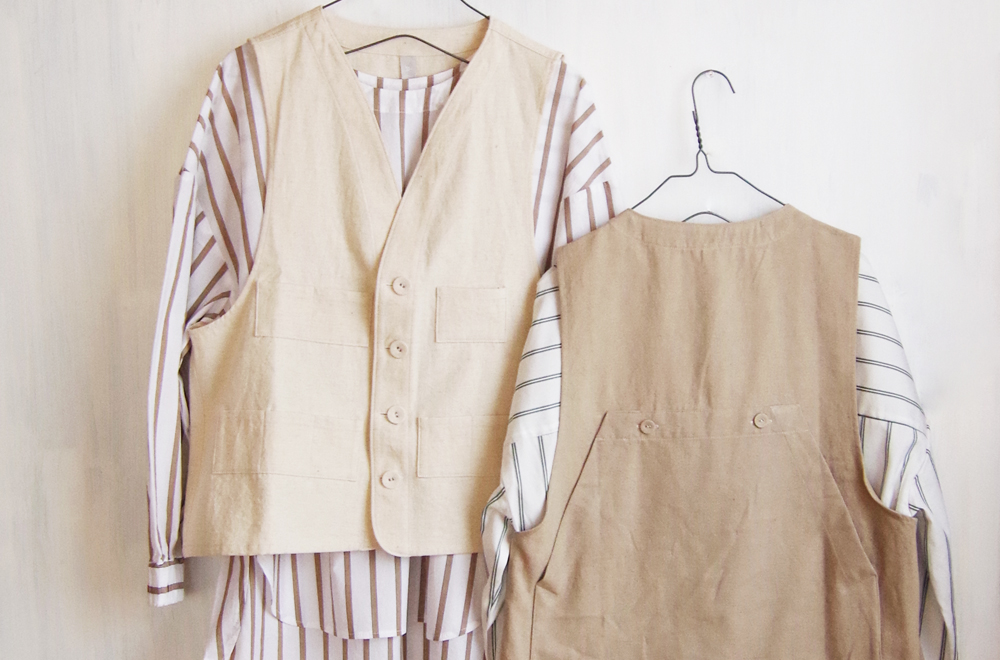 コットンとリネン素材のサラッと羽織れる、Vネックベストも届いています。