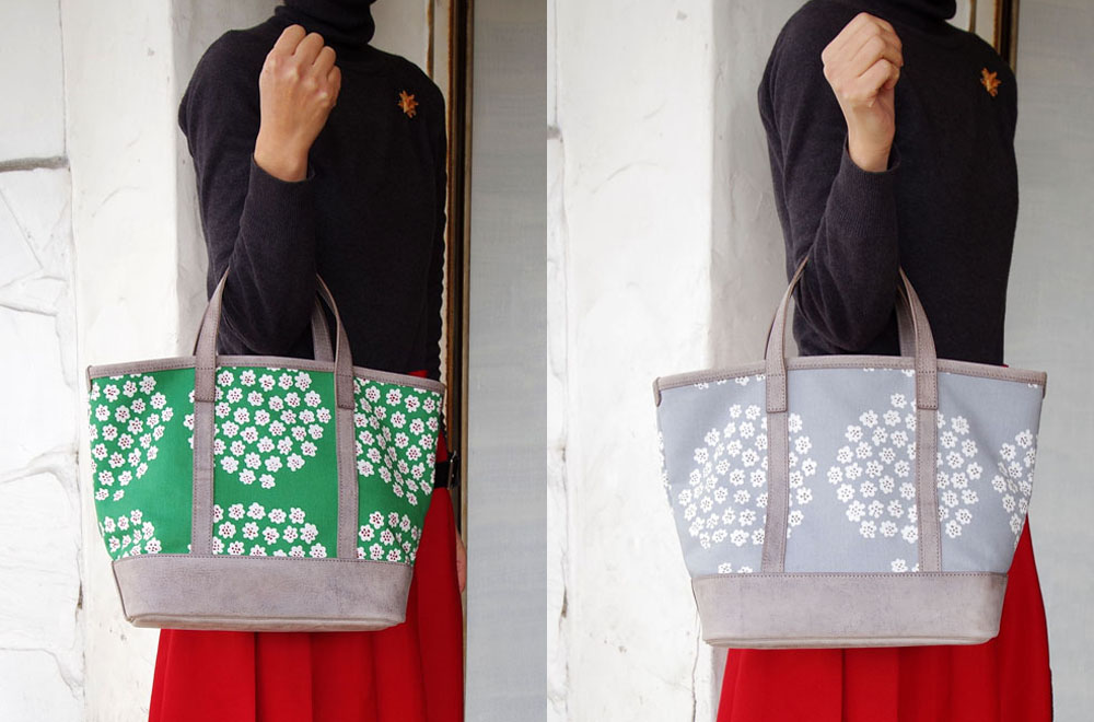 marimekko(マリメッコ)のヴィンテージファブリック「pukettti(プケッティ)」柄のグリーンとグレーを使ったオリジナリティあふれる作品。人気だったグレーカラーが再入荷しています!