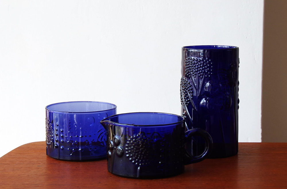 グラスやボウル、珍しいピッチャーやフラワーベースなど、カラーも(クリア・ダークブルー・ブルー・グレー)豊富にございますので、ぜひ美しいガラスのヴィンテージ作品をご覧くださいませ。