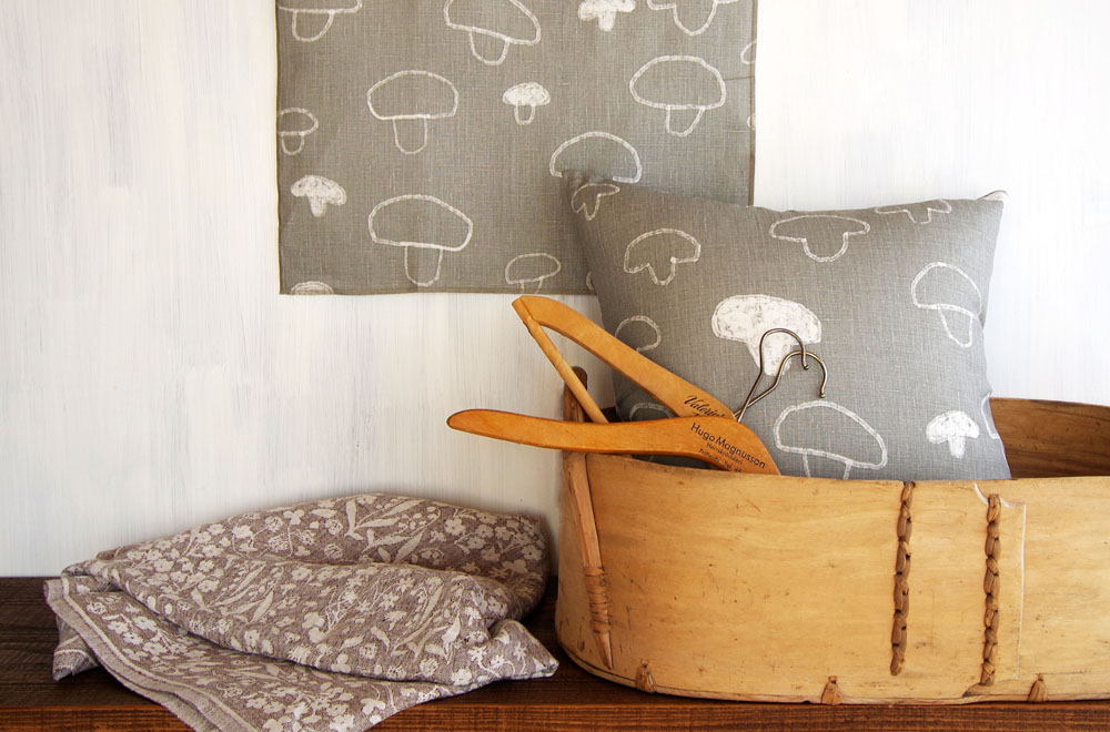 大小さまざまなキノコが描かれた「Mushroom(マッシュルーム)」柄のクッションカバーとティータオル。