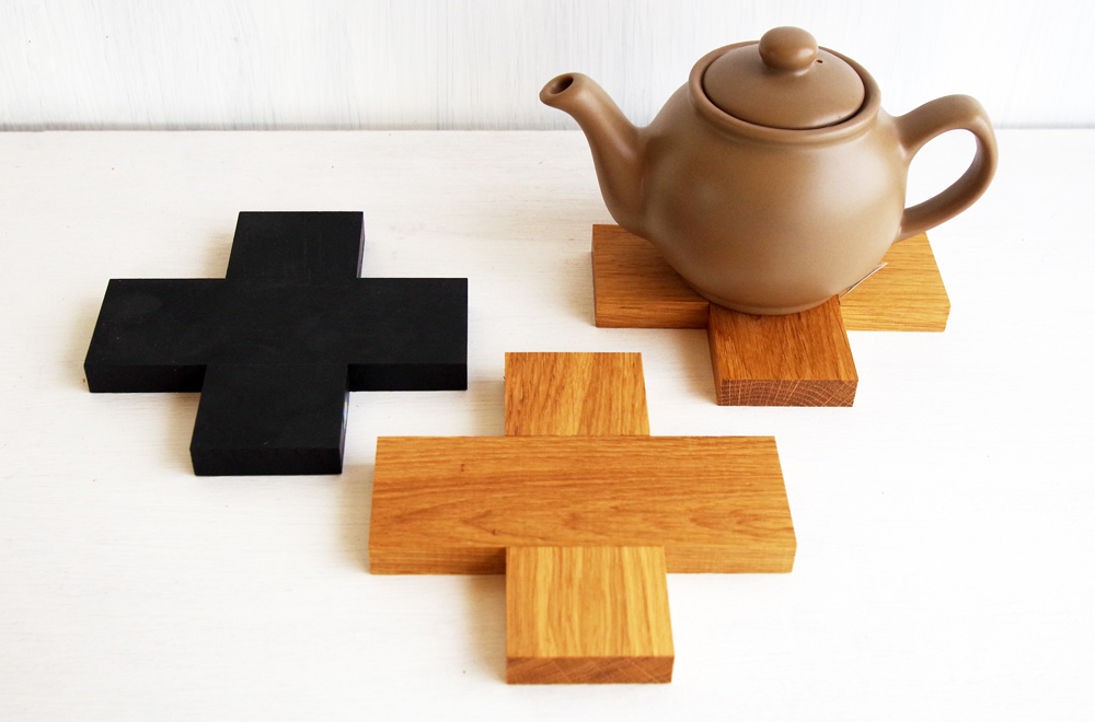 シンプルで使いやすいクロス型の木製鍋敷き。