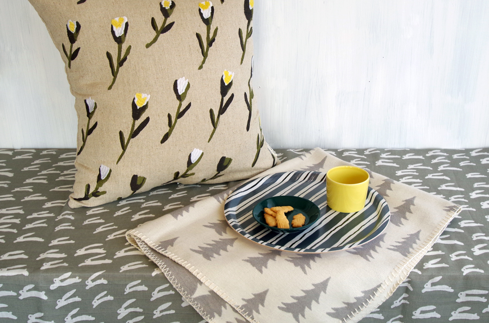 今回の新作は、お花刺繍のクッションカバー、オーガニックコットン素材のブランケット(2種類)、陶芸家「STUDIO OYAMA」大矢真義(おおやまさよし)さんが手掛けたサークルトレイの4アイテム。