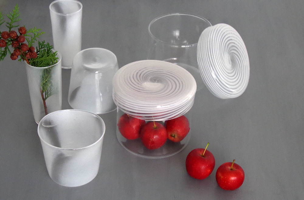 透明なガラスに霧のような、白い模様が入っている、シロガラスシリーズ。