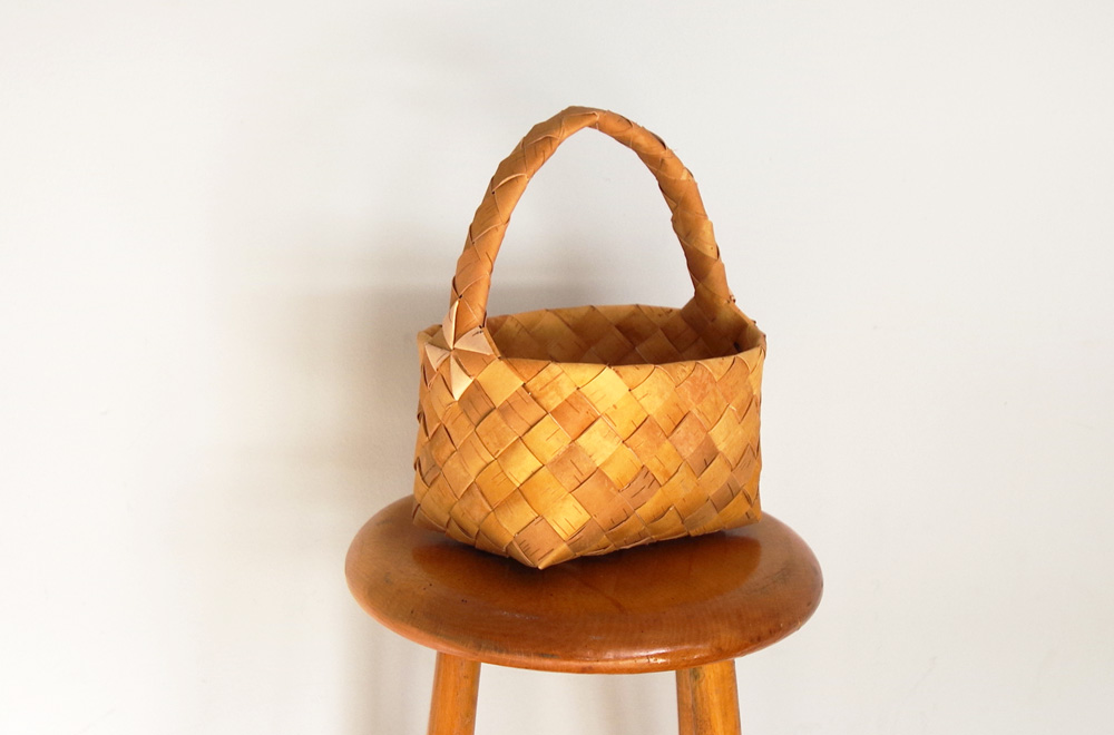 白樺の樹皮を表裏に編むことによって、風車のようなデザインが施されているバスケットや白樺の根の部分を使って編み込まれたバスケット。