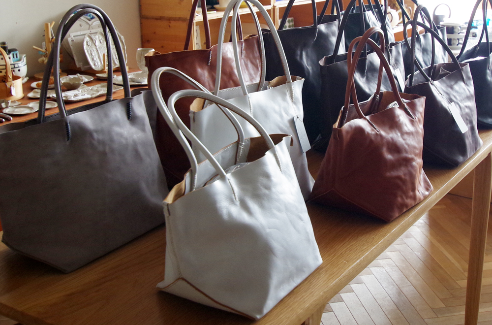 写真は「手縫いトートバッグ」。サイズ、カラーも豊富にたくさん作って頂きました。