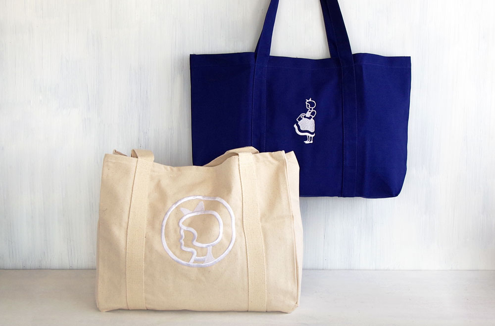 「Irma(イヤマ)」のシンボルマークである、「イヤマちゃん」があしらわれたトートバッグ。キナリとブルーの2種類が再入荷しました。