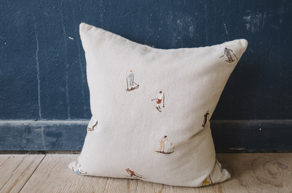 無漂白リネンのナチュラルな風合いと、スキーのデザインが個性的で、可愛らしいクッションカバーです。