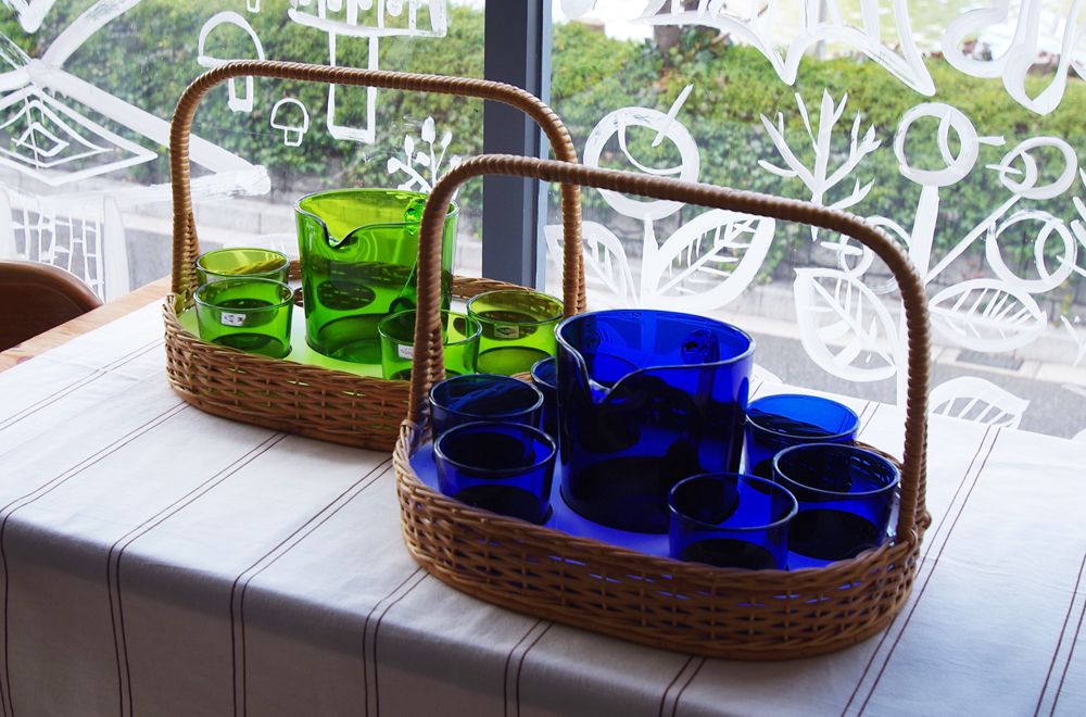 ピッチャーとタンブラー6個、カゴがセットになったシリーズで、カラフルなアソートのものも作られましたが、今回は同色セットのグリーンとブルーの2色が入荷しています。