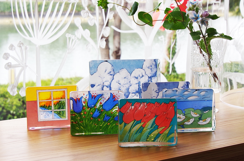 写真はガラスオブジェ。鮮やかなお花や窓辺、雪景色とガラスの相性が素敵な作品です。