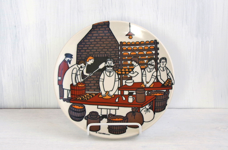 カレワラでおなじみの、Raija Uosikkinen(ライヤ・ウオシッキネン)がデザインした、ほっこり温かみを感じられる絵柄とカラー。当時のパン職人の様子が見て取れる、可愛らしい絵柄が素敵です。