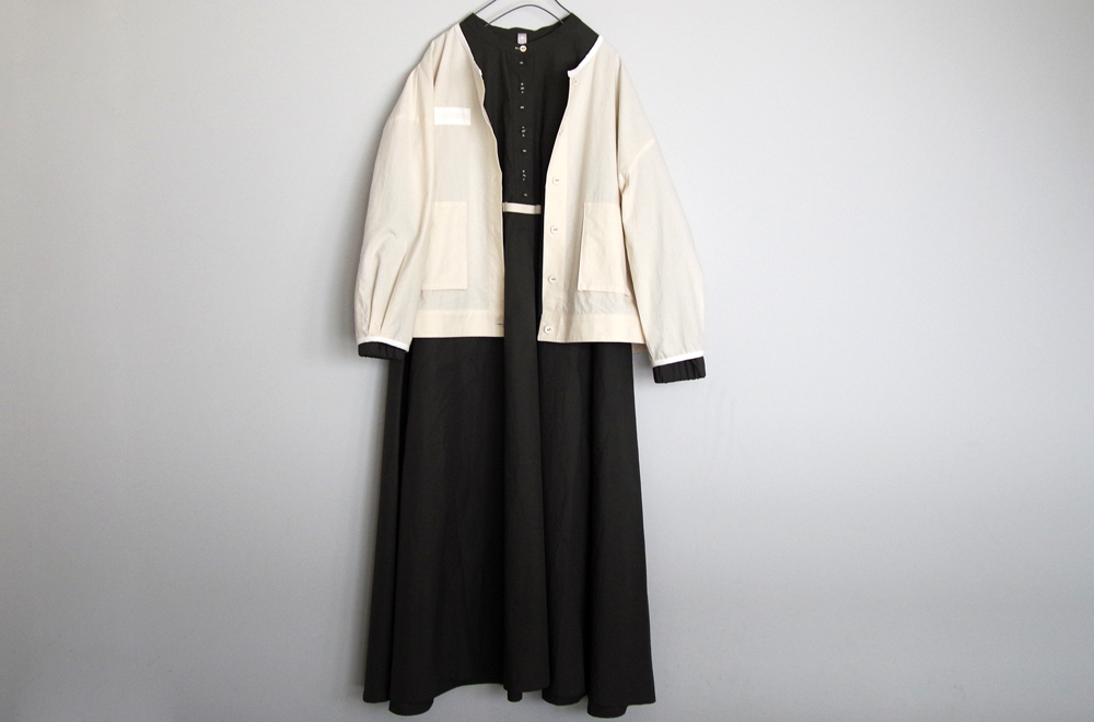白いくるみ釦が映える、チャコールのマキシ丈ワンピース。