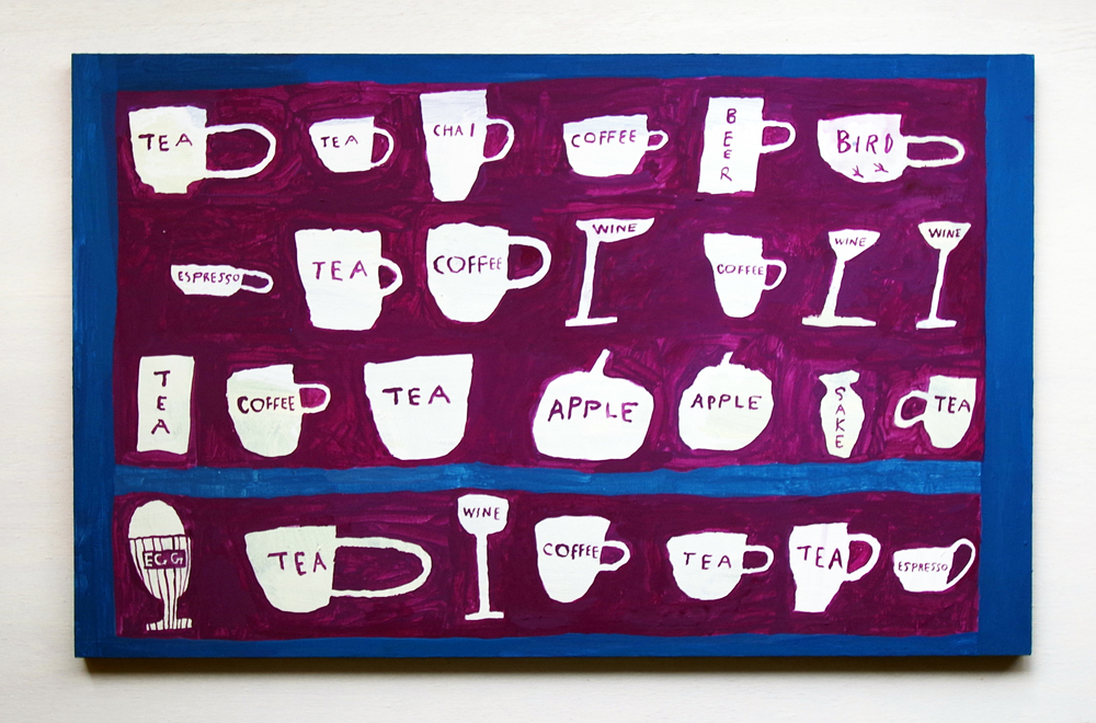 Tea、CHAI、COFFEE、BEER、WINE、、、様々なドリンクが描かれた中には、BIRDやAPPLE、EGGの文字も。