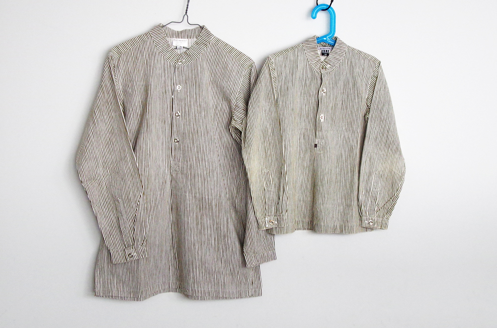写真は、細いストライプのシャツ。メンズとキッズサイズがあるので、親子でお揃いが可愛いです。