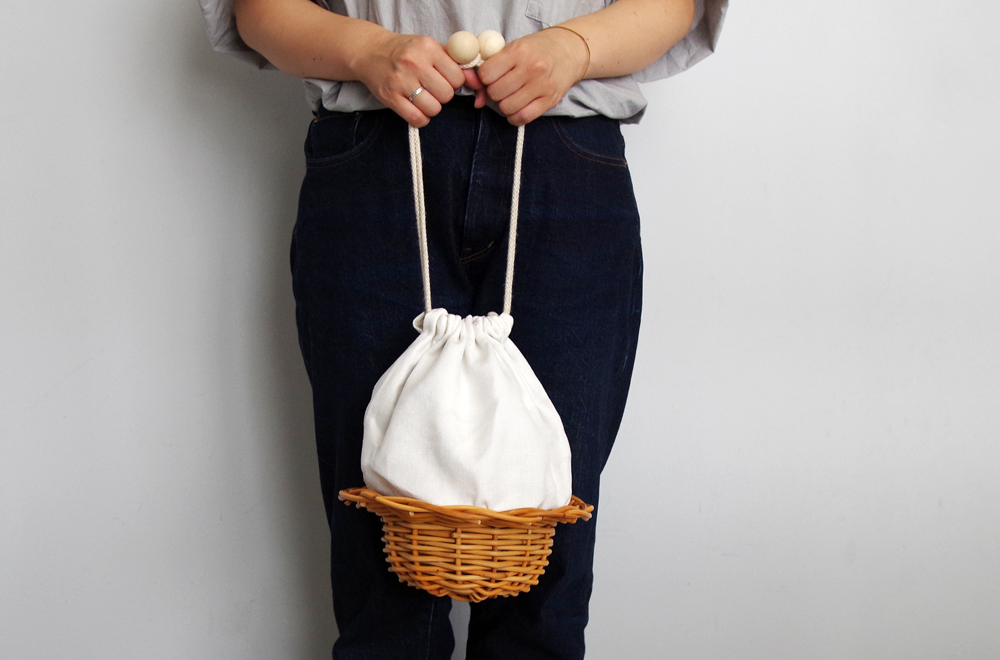 追加で届いた可愛らしい巾着バッグ。籐の部分が、帽子のような形になっています。