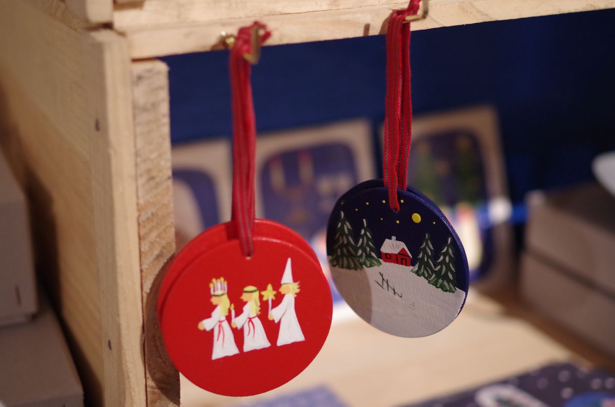 もみの木に囲まれた雪の中に佇む赤い家と、クリスマスを祝う人々がそれぞれモチーフとなっているクリスマスオーナメントです。
