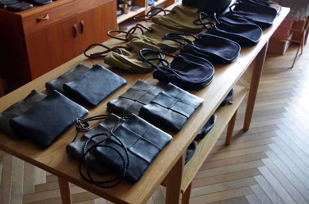 代表作の鹿革を使った巾着バッグなど、種類もサイズも豊富に並んでいます。