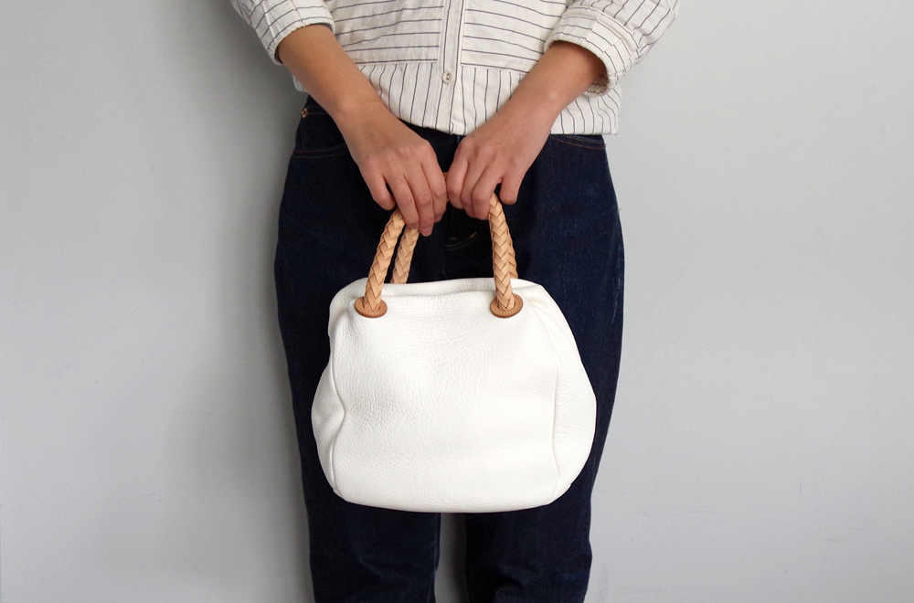 写真は、白の鹿革を使った巾着トートバッグ。冬に持つ「白」、とても素敵です。