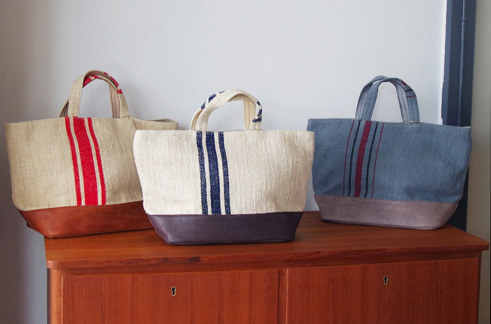 新作のアンティークリネンと革を組み合わせたバッグ。