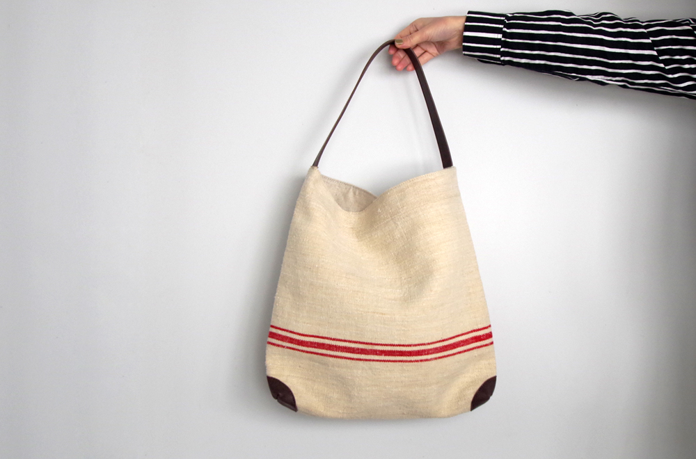 ナチュラルな雰囲気のアンティークリネンとかっちりとした印象の革を合わせた異素材ミックスの鞄。