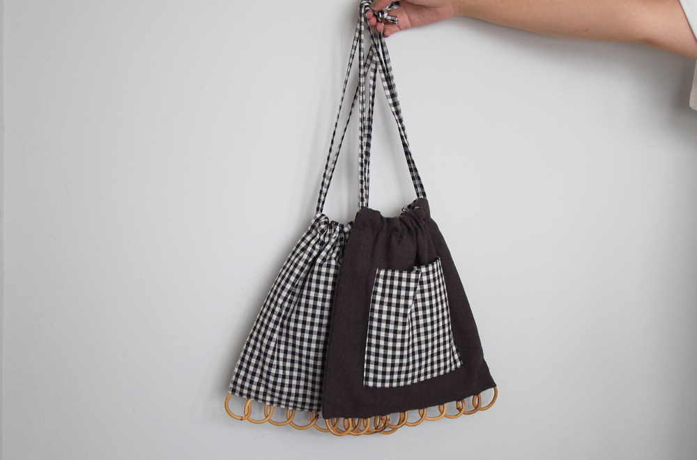可愛らしい生地と籐の小さな巾着バッグ。
