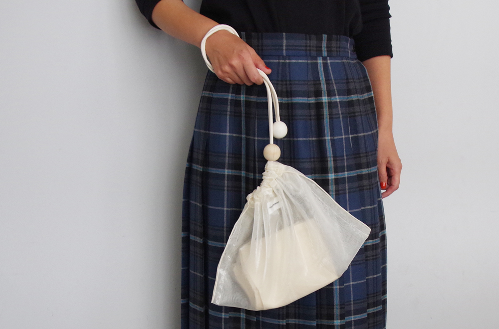 個展の際には、たくさんの方に手に取っていただいた「takayo katayama」さんのオーガンジー素材のバッグ。全4色「black/white/blue/pink」が再入荷しました。