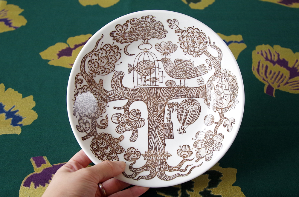 大きな木を中心に、魚や鳥、愛し合う男女が描かれており、独特な世界観があるデザイン。