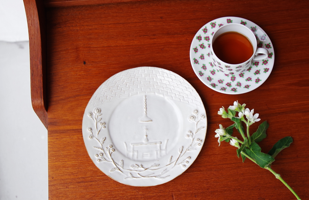 テーブルの上にも一輪飾られており、そのまま飾りたくなる、物語を感じるお皿です。