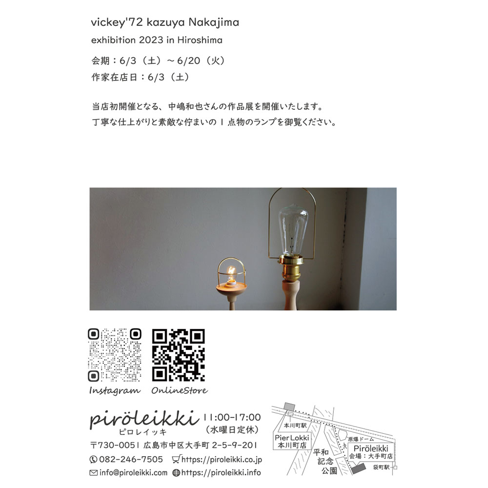 新潟県長岡市にアトリエ兼店舗を構え、木製のランプスタンドやアクセサリー等を制作する「vickey’72 中嶋和也」さんの広島当店では初となる作品展を開催致します。