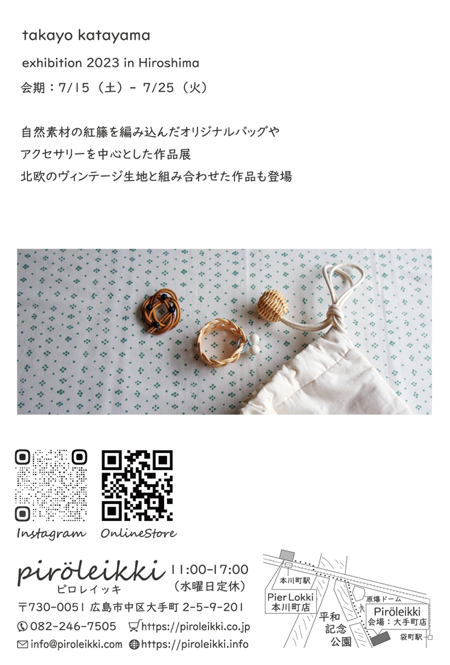 自然素材の紅籐を編み込んだオリジナルバッグやアクセサリーを中心とした「籐(とう/ラタン)」作品。岡山を拠点に活動される「takayo katayama」さんの展示会を開催いたします。